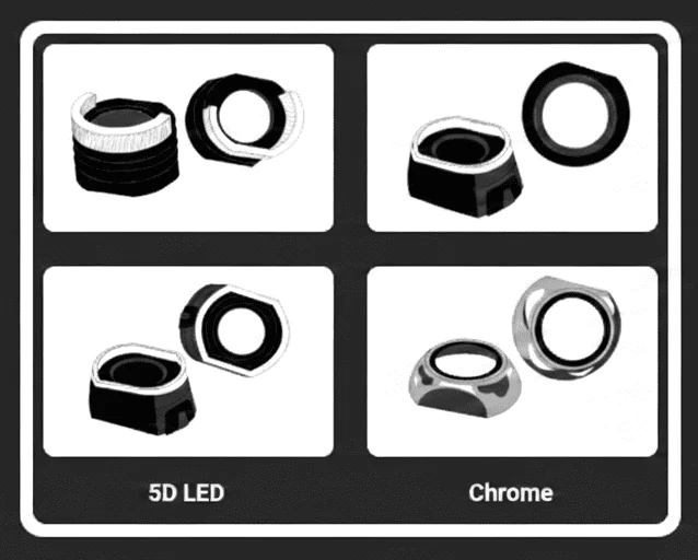 Яка різниця між 5D LED та звичайними LED масками? 5D — яскравіша та рівномірніша підсвітка, часто з RGB. Звичайні LED — простіша біла підсвітка в хромі.