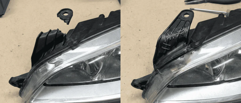 Ви зрізаєте залишки зламаного вуха під нуль. Берете нове кріплення з ремкомплекту (це ідеально відлита деталь), прикладаєте на штатне місце і прикручуєте на 2-3 гвинти, які йдуть у наборі. Іноді вони стають на клямки.